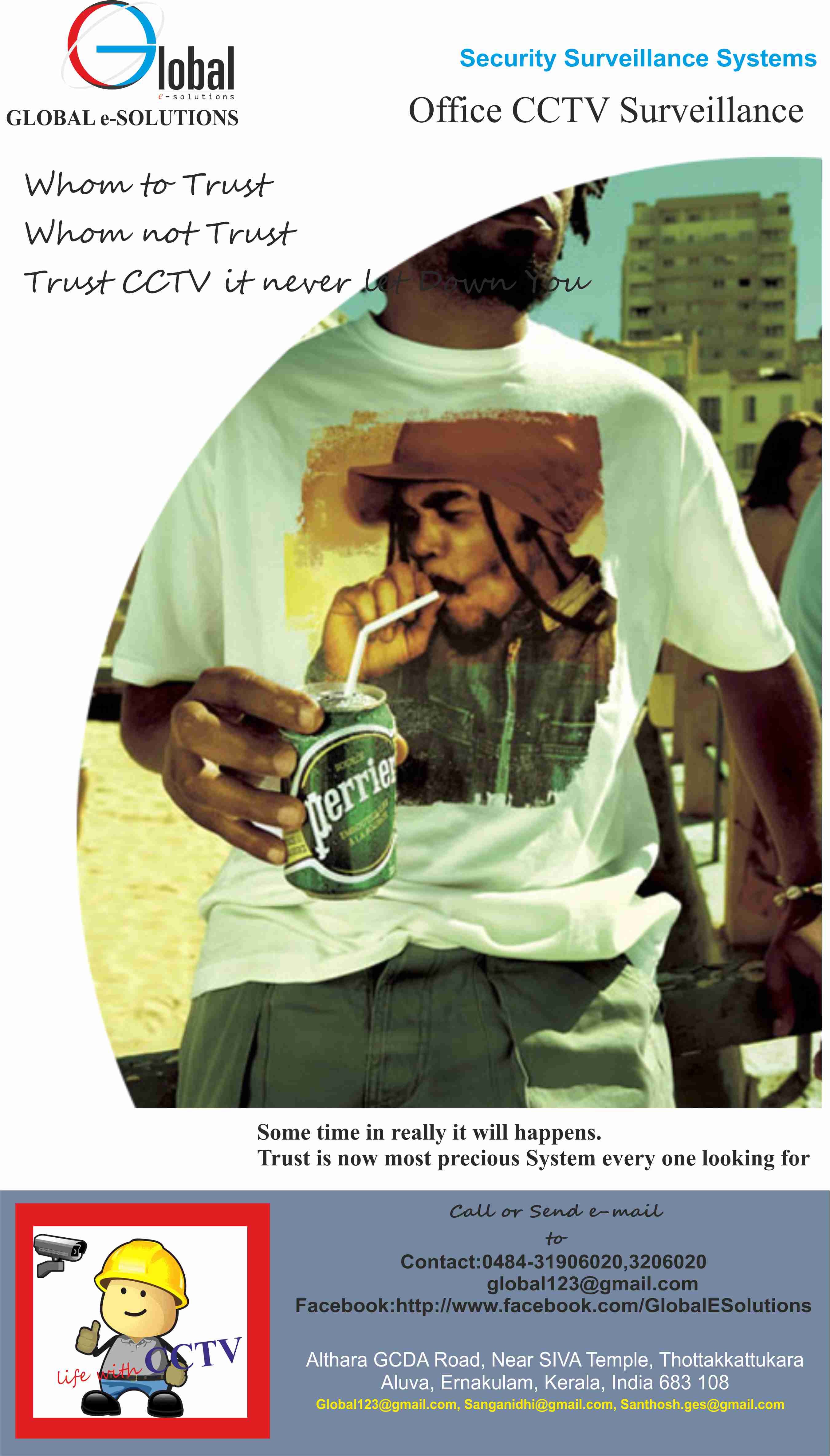 Call Global e Solutions Cell: +919048803007, +919846179999, 9961602200 visit https://www.globalesolutions.co.in/contact.html PROFESSIONAL SECURITY SYSTEMS CCTV Installation in Kerala CCTV make our lives safer, since it can spot accidents as they happen and you can take immediate actions. Call Smart eyes today and get CCTV installed in your office and home and make your place and feel more safer.